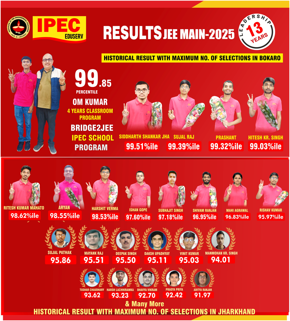 With over a decade of excellence, IPEC Bokaro continues to shape the future of IIT aspirants, delivering top city ranks and AIRs in the most coveted engineering entrance examination in the country. We are proud of our students’ achievements and are committed to continuing this legacy of success.